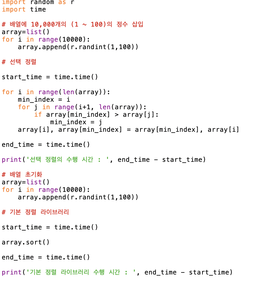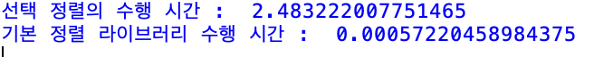 수행 시간을 측정하는 소스코드를 사용해서 선택정렬과 기본 정렬 라이브러리의 수행 시간을 비교하는 코드를 작성해보자.