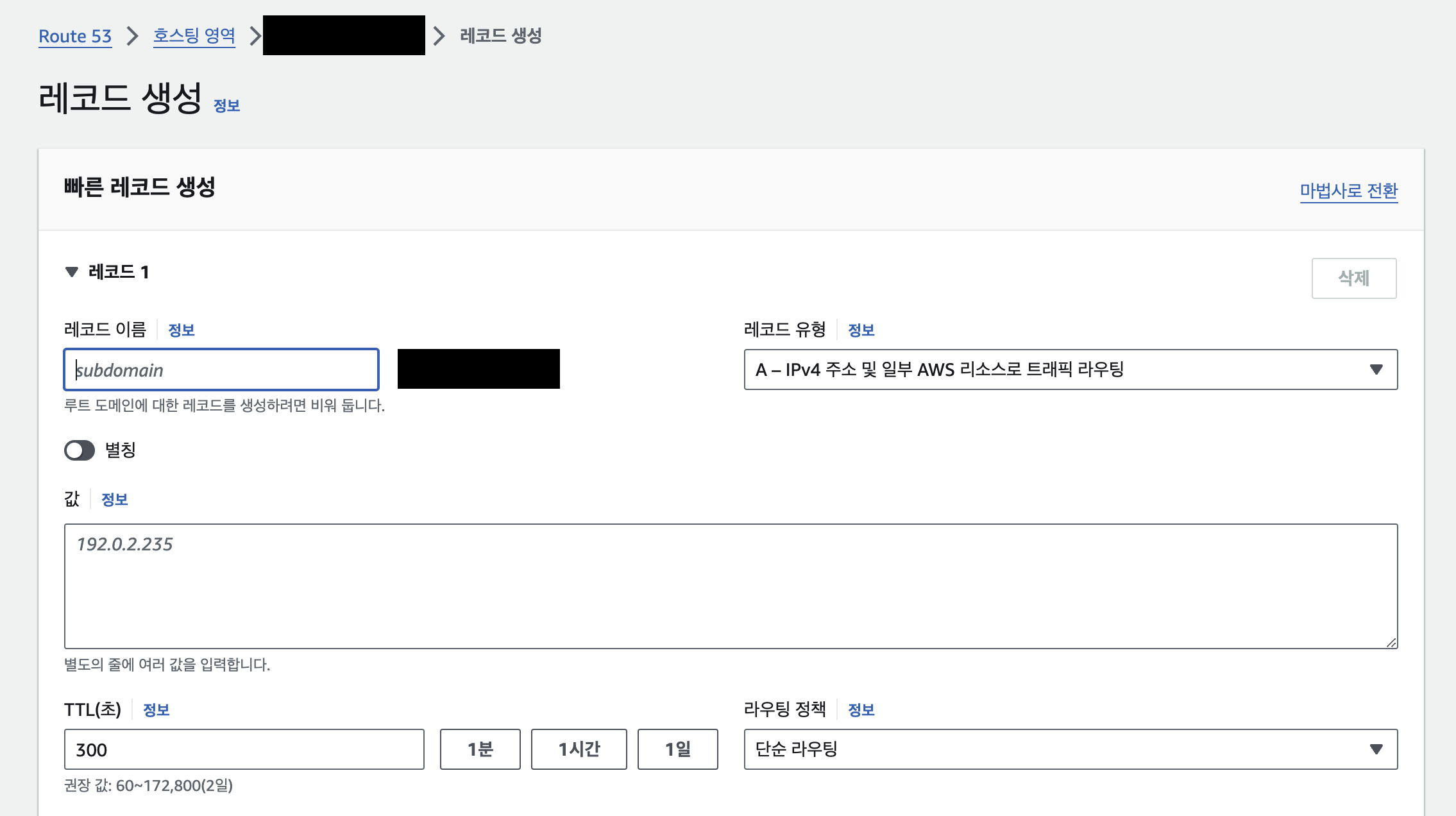 - 생성한 호스팅 영역 > 레코드 생성