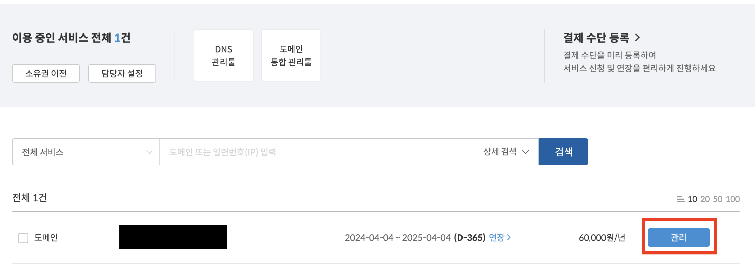 - 구매한 도메인에 대해서 관리 클릭