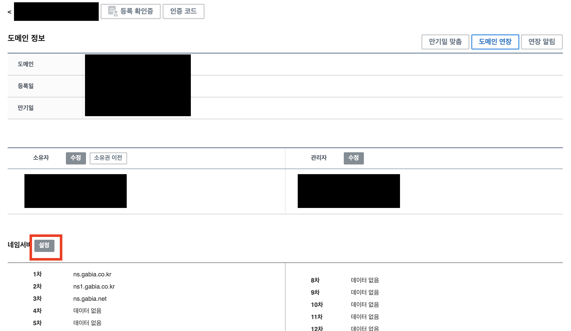 - 하단의 네임서버 탭의 설정 클릭
