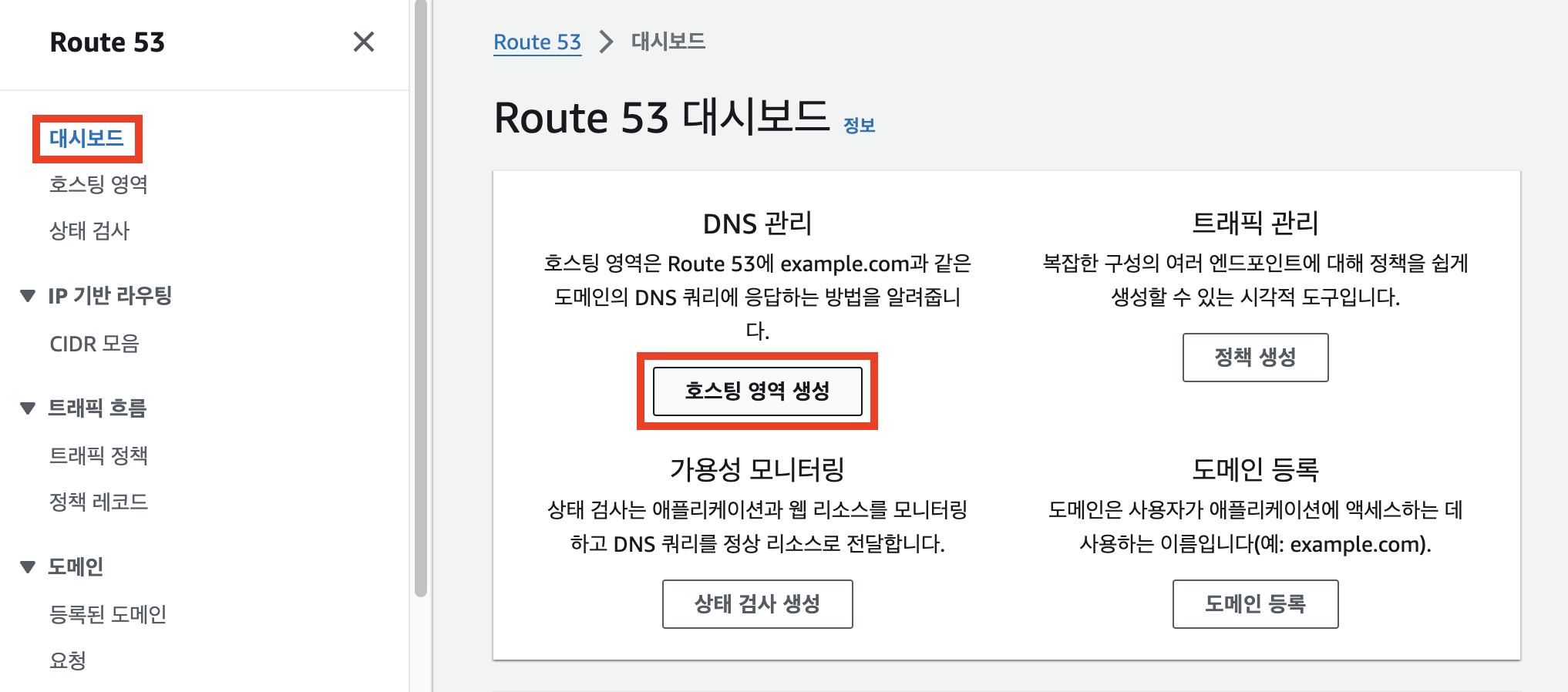 - 대시보드 > 호스팅 영역 생성
