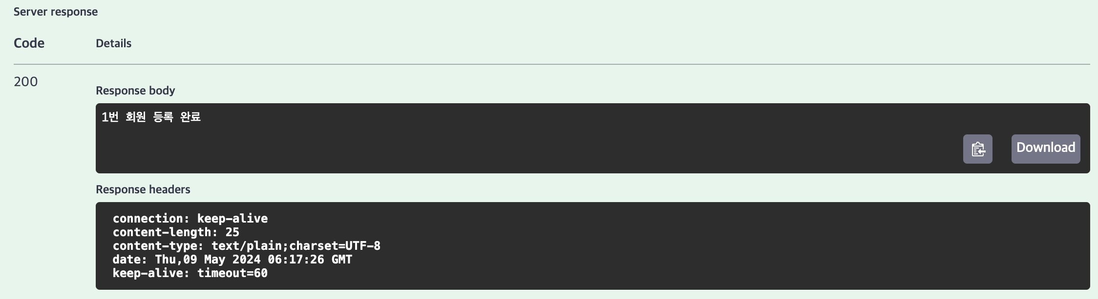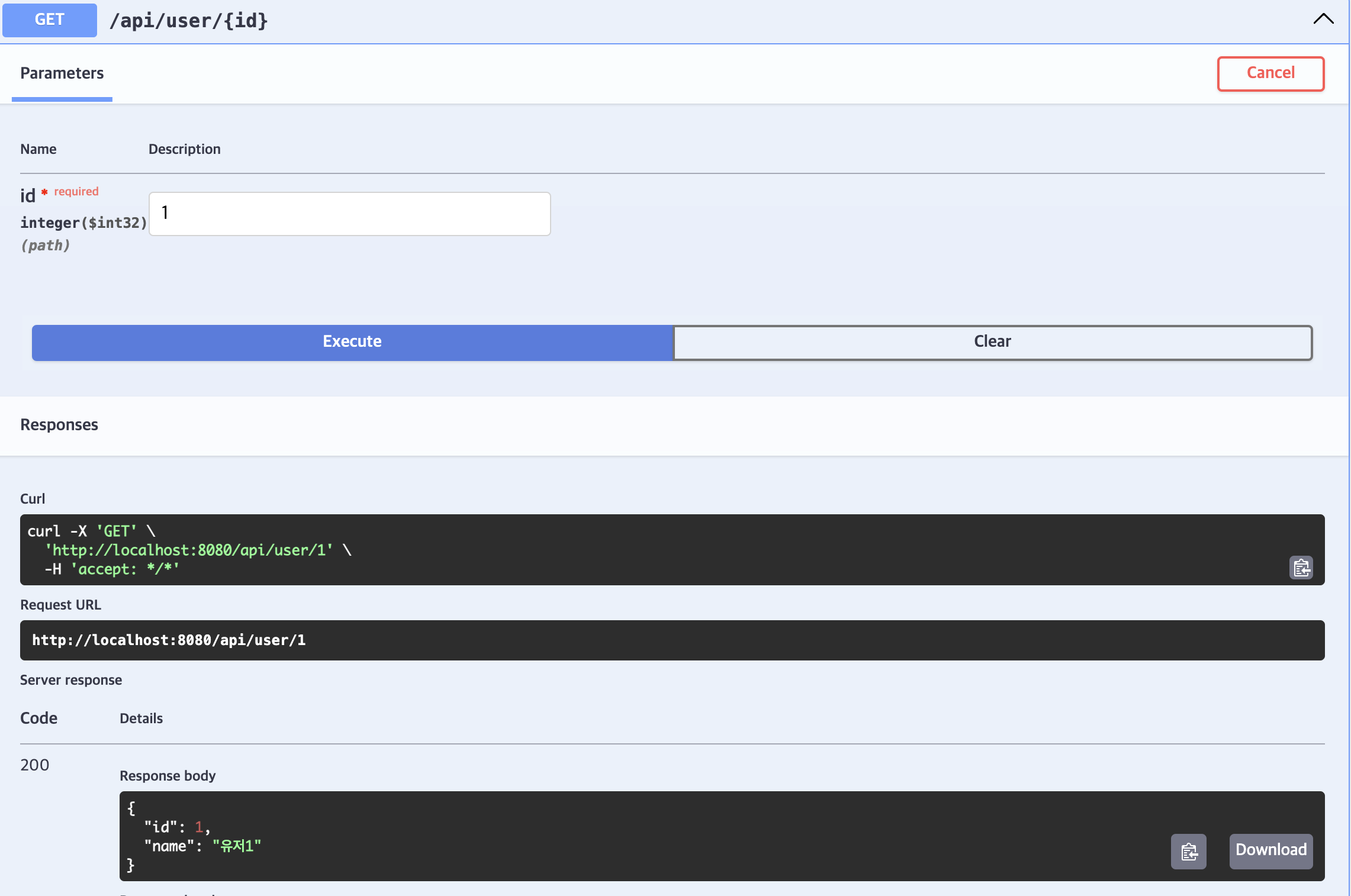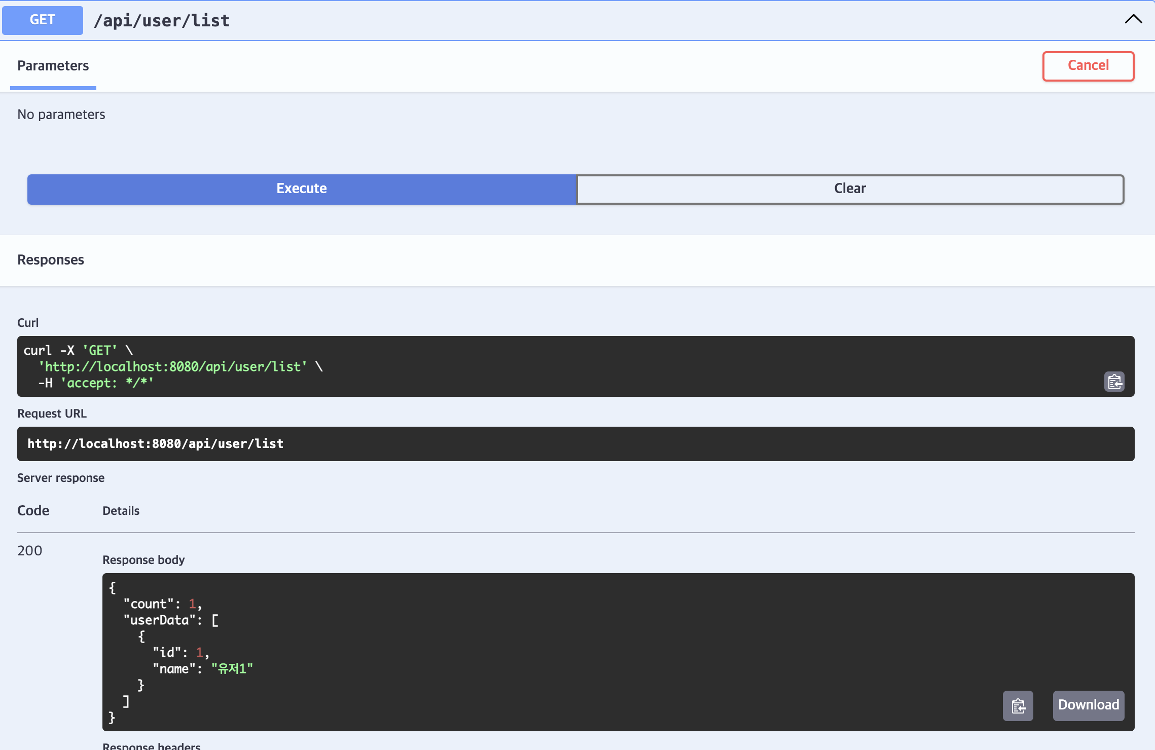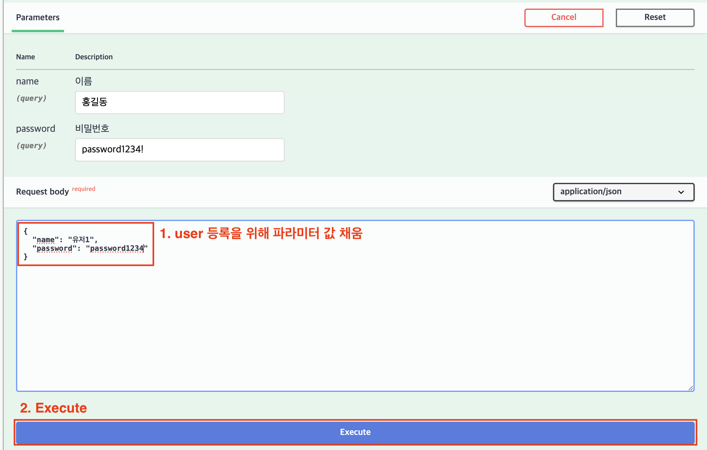 - Request body 에서 파라미터 채우고 Execute 클릭