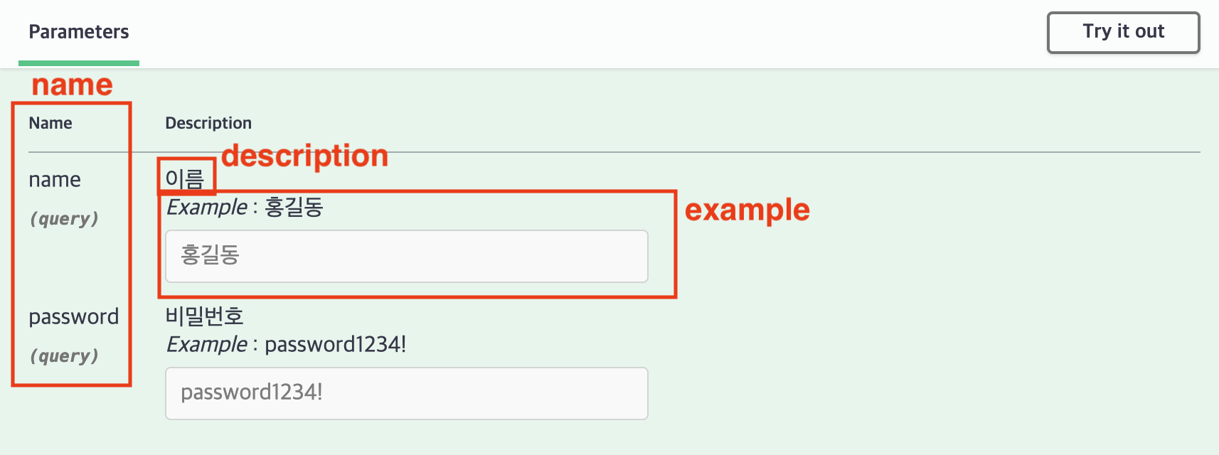 @Parameter(name = "name", description = "이름", example = "홍길동"),