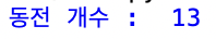실행결과 동전의 개수는 13개로 출력되는데, 500원 7개, 100원 2개, 50원 1개, 10원 3개로 이는 정답에 해당하는 것을 알 수 있다.