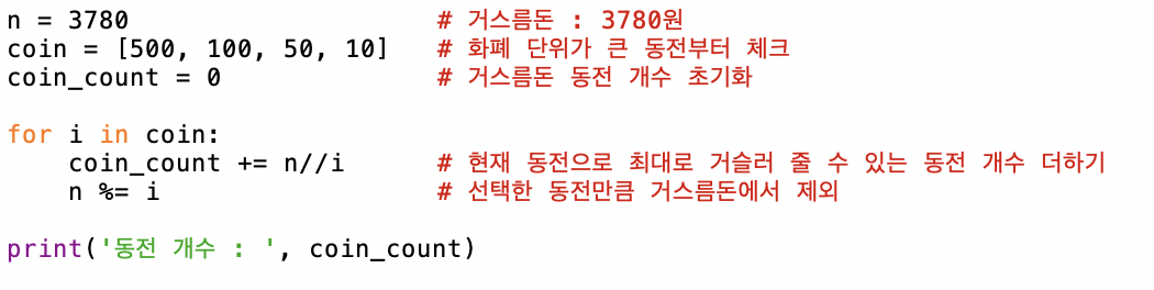 거슬러 줘야 할 돈 N을 3780원이라고 가정한다. 순차적으로 가장 큰 화폐 단위인 500원, 100원, 50원, 10원 순서대로 거슬러 줄 수 있는 최대 개수로 거슬러 주면 최종적으로 거슬러 줄 동전 개수가 최소가 되는 것이다.
