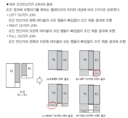 -- 주소가 같은 학생들의 이름을 쌍으로 검색, 이때 첫번째 학생이 두번째 학생보다 학년이 높도록 설정 SELECT s1.이름, s2.이름 FROM 학생 s1 JOIN 학생 s2 ON s1.주소 = s2.주소 WHERE s1.학년 > s2.학년; - 외부 조인 (OUTER JOIN)