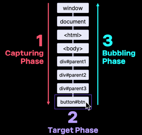 - 이벤트가 최상위 부모 요소 부터 이벤트가 발생한 특정 요소 (타겟) 까지 전파됨