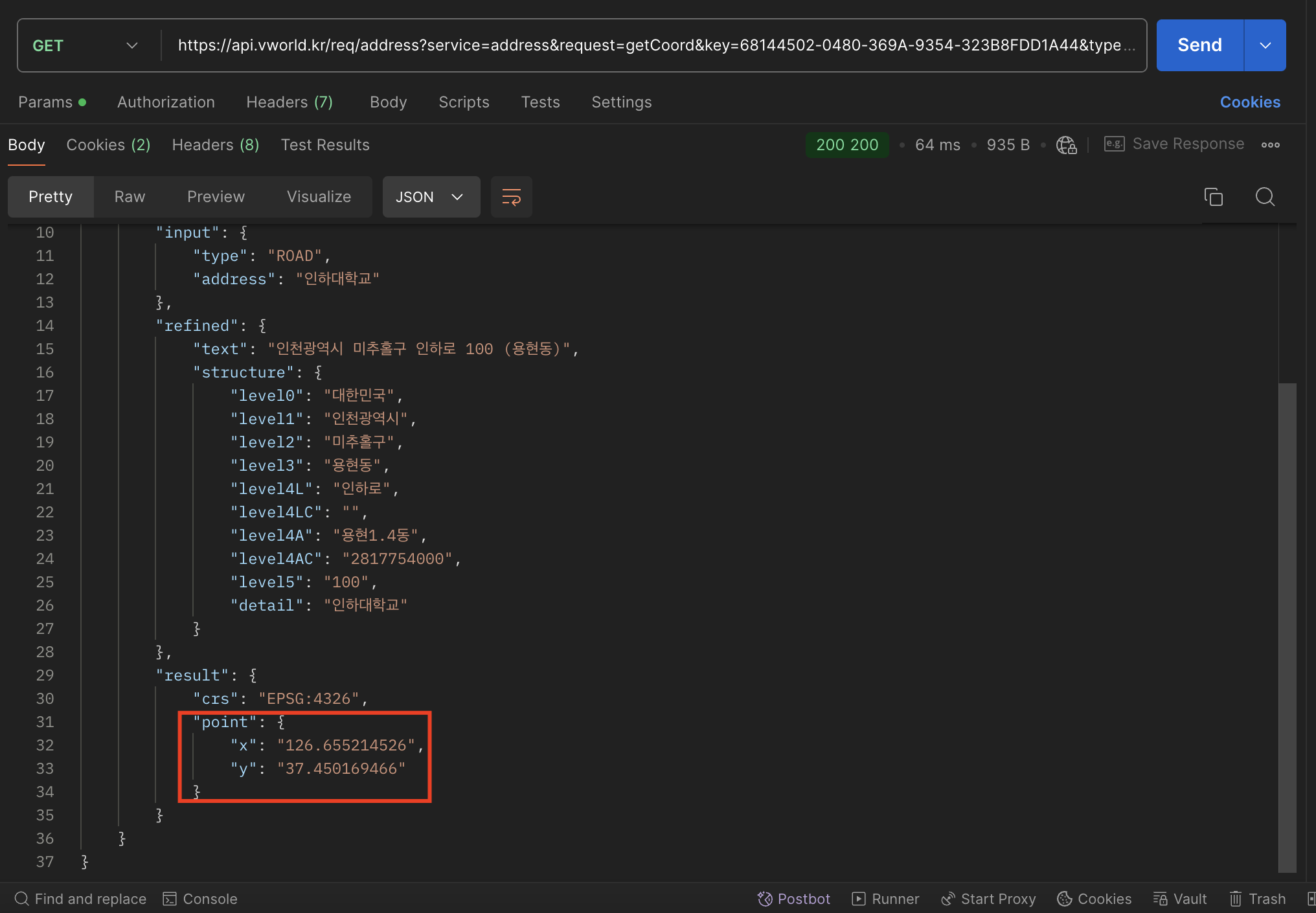 원하던 위도, 경도 정보를 반환받음을 확인!