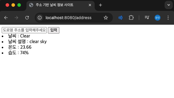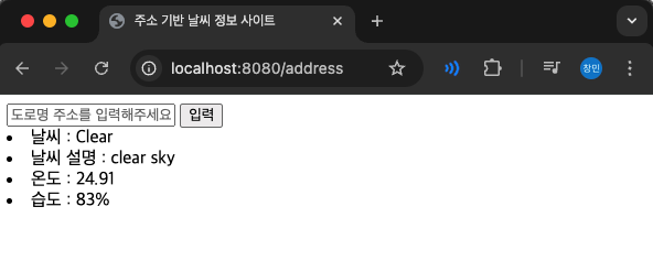 - 목적 : open weather map API와 연동하여 주소 입력을 통한 날씨 정보 가져오는 프로젝트