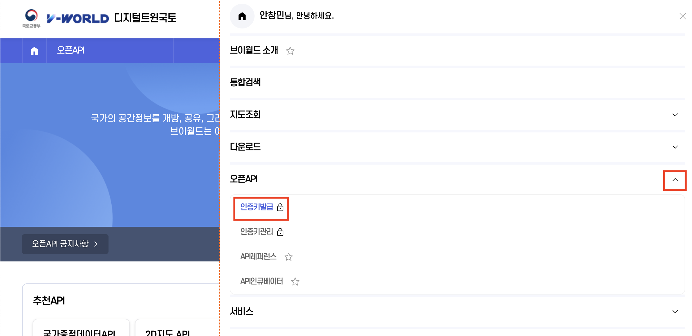 - 오픈 API > 인증키발급 클릭