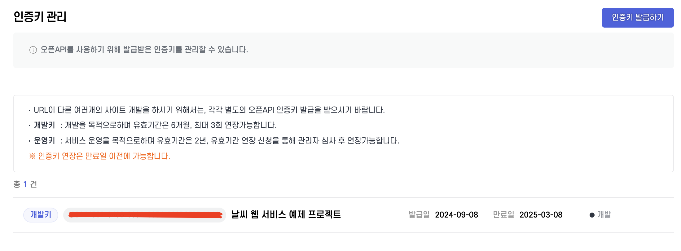 - 인증키 발급 확인