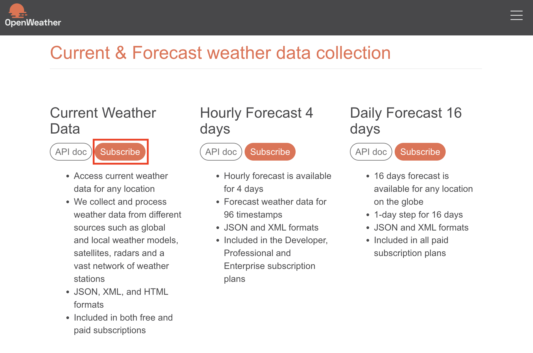 - (https://openweathermap.org/api) Subscribe 버튼 클릭