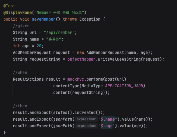 jsonPath(”$.필드”).value(실제값) : JSON 응답의 필드 값이 실제값과 일치하는 지 확인