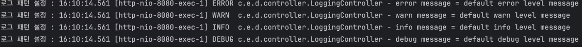 log.warn("warn message = default warn level message"); // warn 레벨 로그