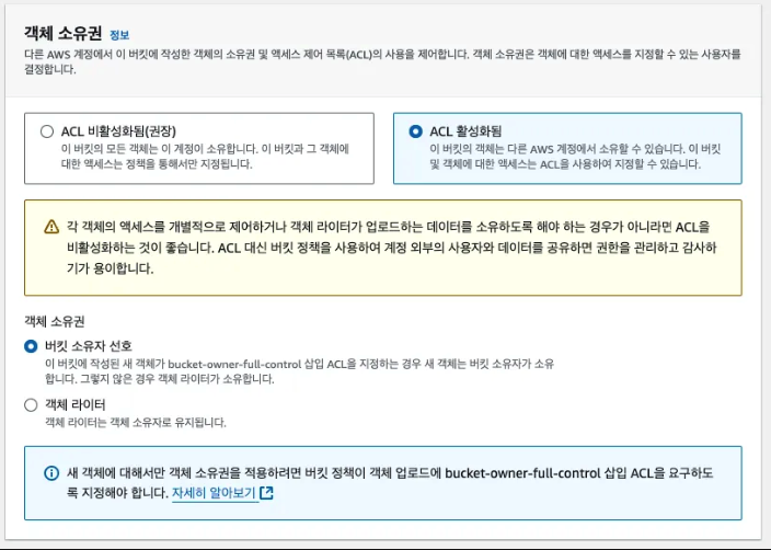 - 객체 소유권 : 버킷 소유자 선호
