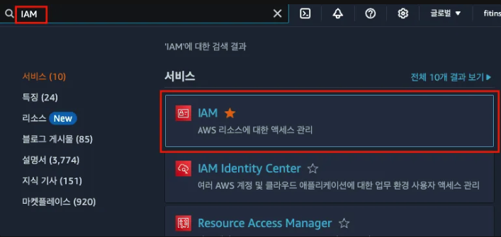 - 검색창에서 IAM 검색