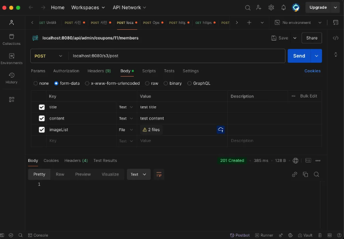 - POST 요청을 보낼 때 포함되어 있던 2개의 이미지가 업로드 됨을 확인