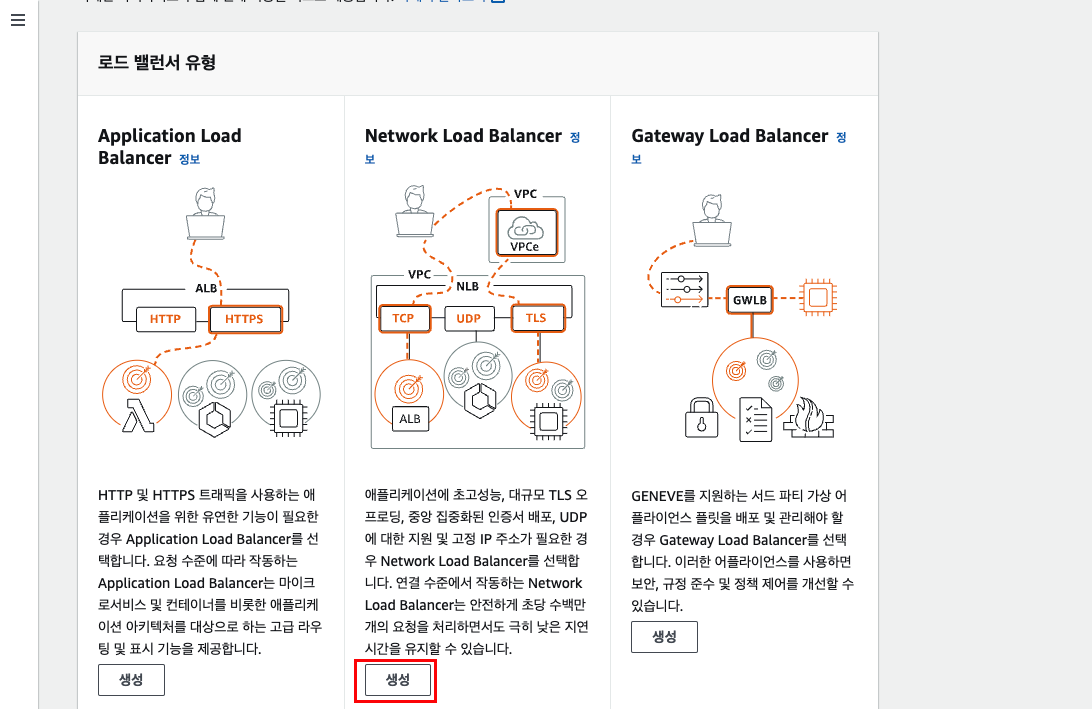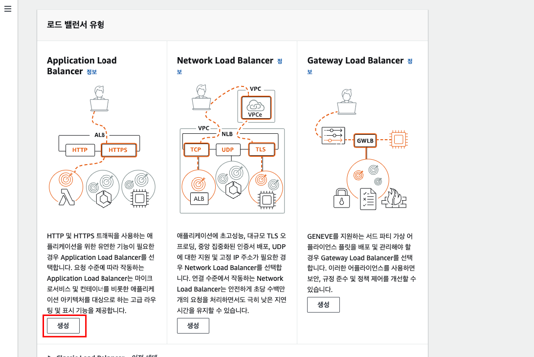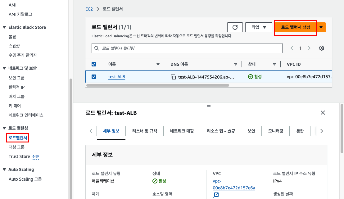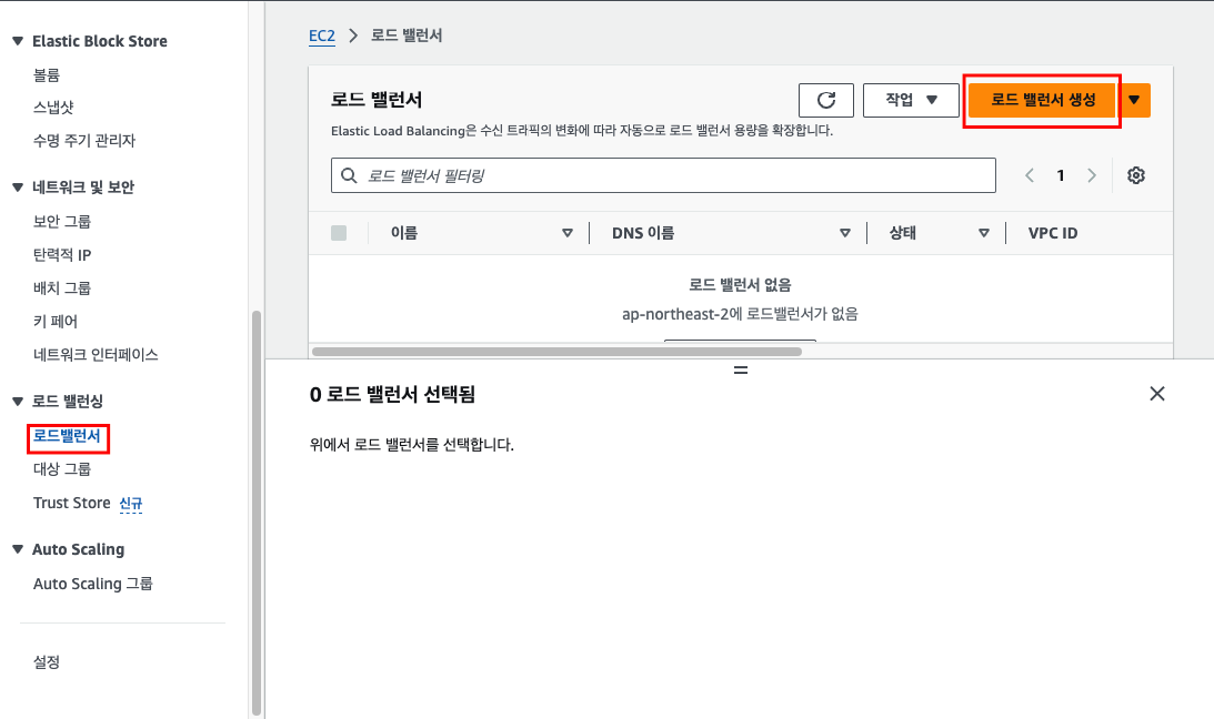 - 왼쪽의 로드밸런서 클릭 → 로드 밸런서 생성 클릭