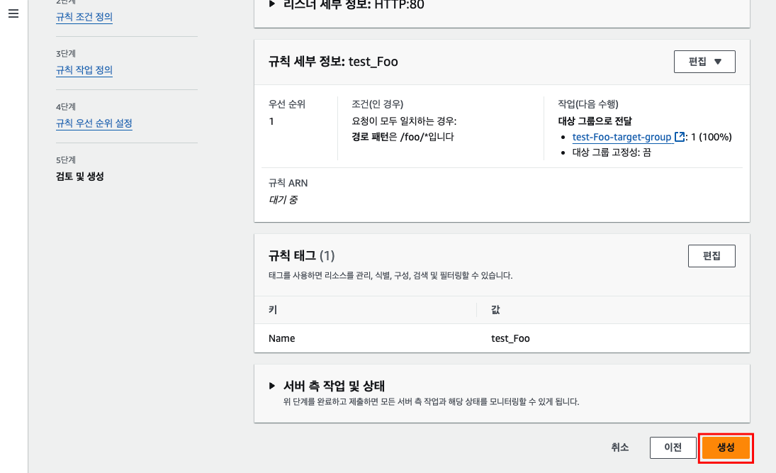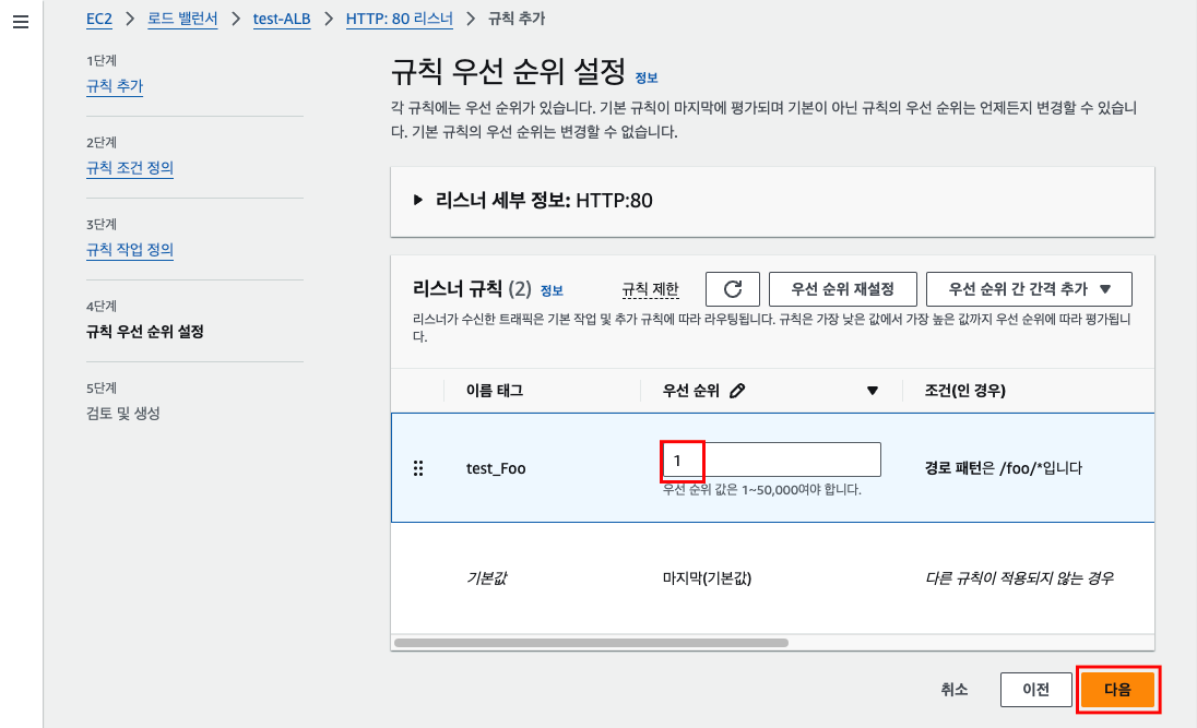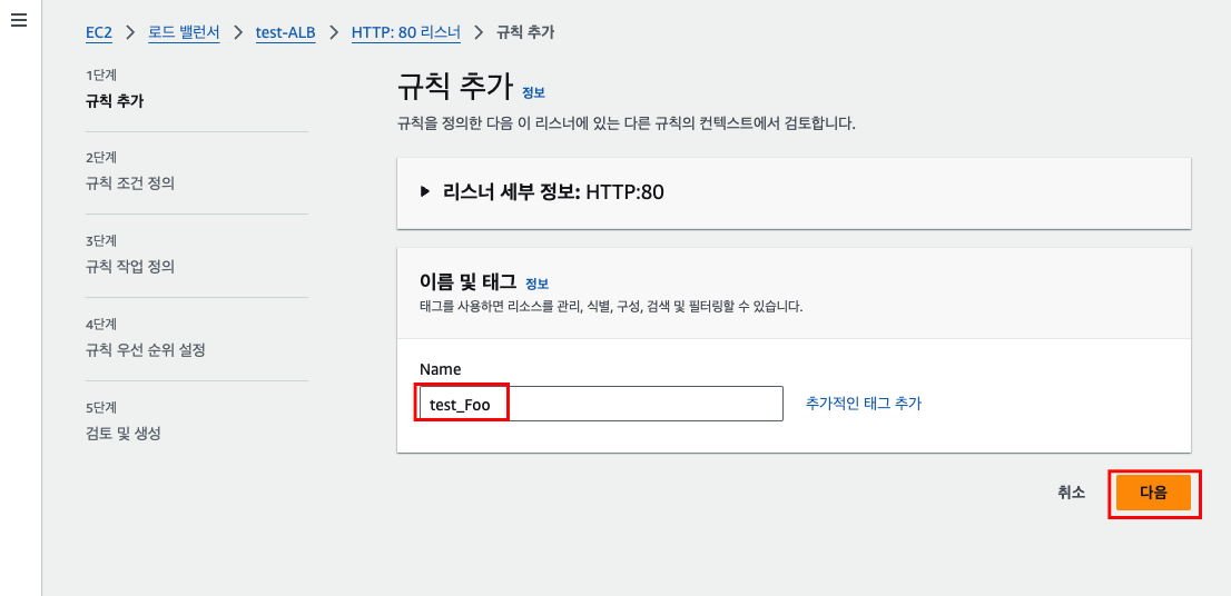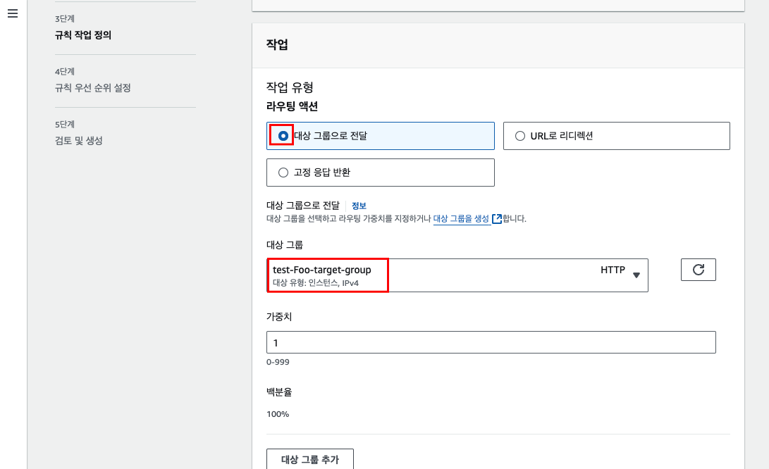 - 대상 그룹으로 전달 선택 → 대상 그룹 (test-Foo-target-group) 선택 → 다음 클릭