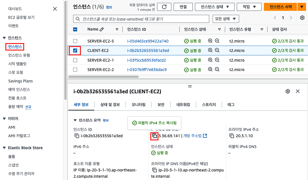 - 왼쪽의 인스턴스 클릭 → CLIENT-EC2 체크 → 퍼블릭 IPv4 복사
