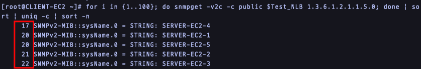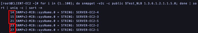 for i in {1..100}; do snmpget -v2c -c public $Test_NLB 1.3.6.1.2.1.1.5.0; done | sort | uniq -c | sort -n
