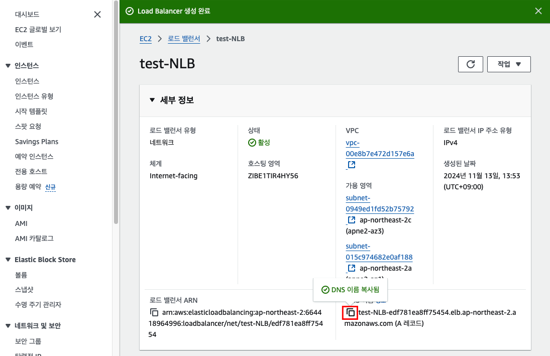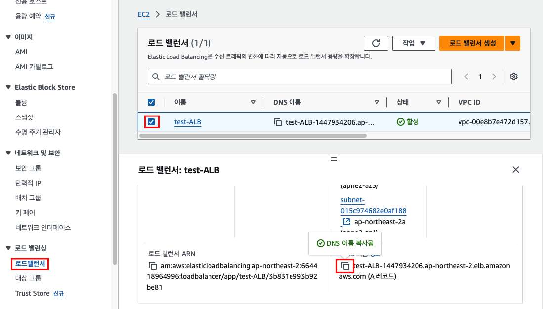 - AWS에서 왼쪽의 로드 밸런서 클릭 → 생성한 로드 밸런서 체크 → DNS 이름 복사