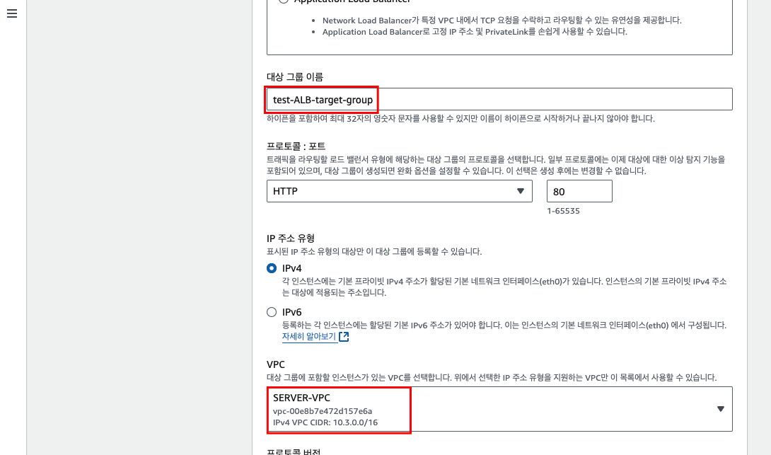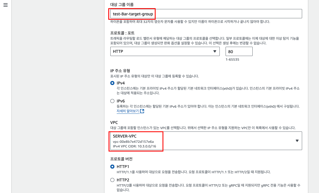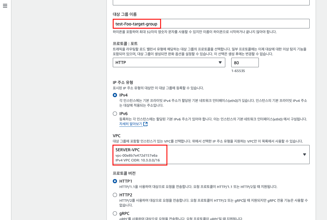 - 인스턴스 선택 → 대상 그룹 이름 입력 → SERVER-VPC 선택 → 다음 클릭