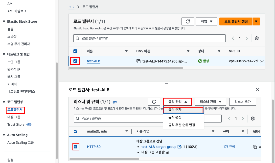 - 왼쪽에서 로드밸런서 클릭 → test-ALB 체크 → 리스너 및 규칙 탭 클릭 → HTTP:80 체크 → 규칙 관리 클릭 → 규칙 추가 클릭
