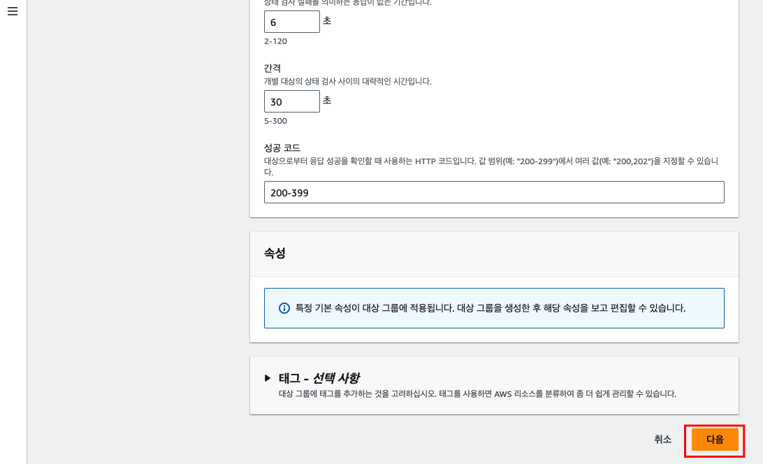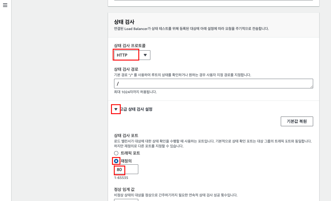 - 상태 검사 프로토콜: HTTP 선택 → 고급 상태 검사 설정 탭 열기 → 상태 검사 포트 : 재정의 선택 → 80 입력 → 다음 클릭