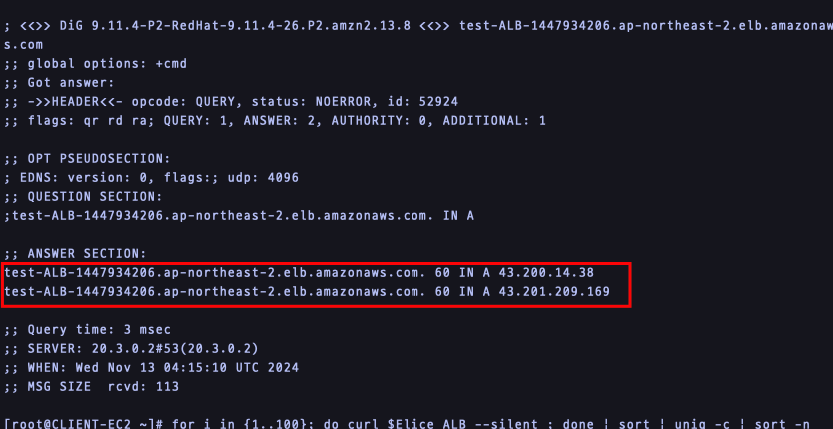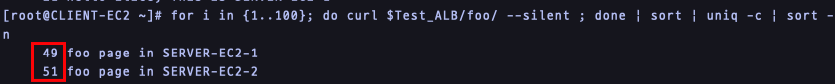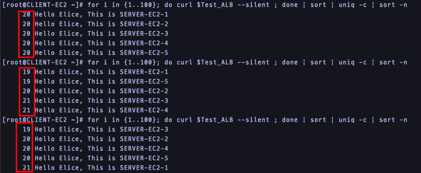 for i in {1..100}; do curl $Test_ALB --silent ; done | sort | uniq -c | sort -n