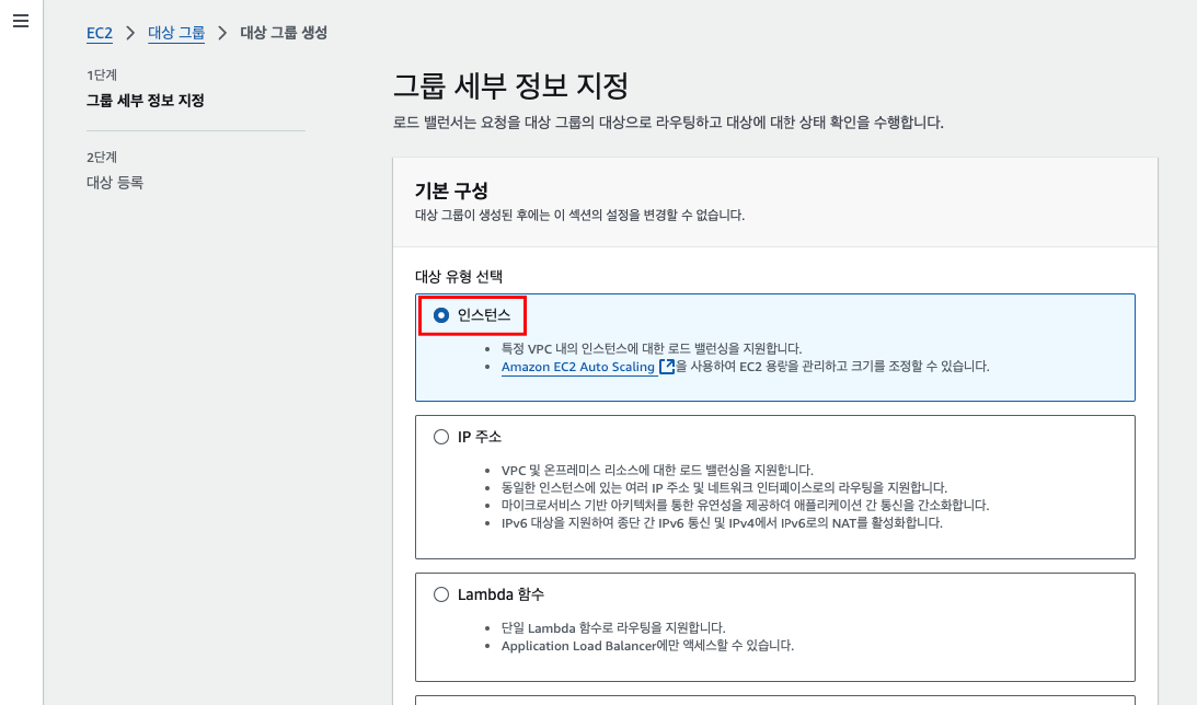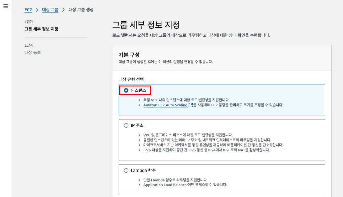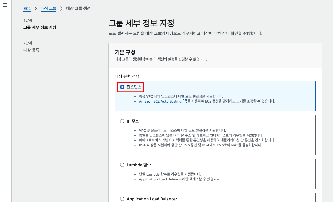 - 체크한 인스턴스가 대상으로 추가됨을 확인 → 대상 그룹 생성 클릭