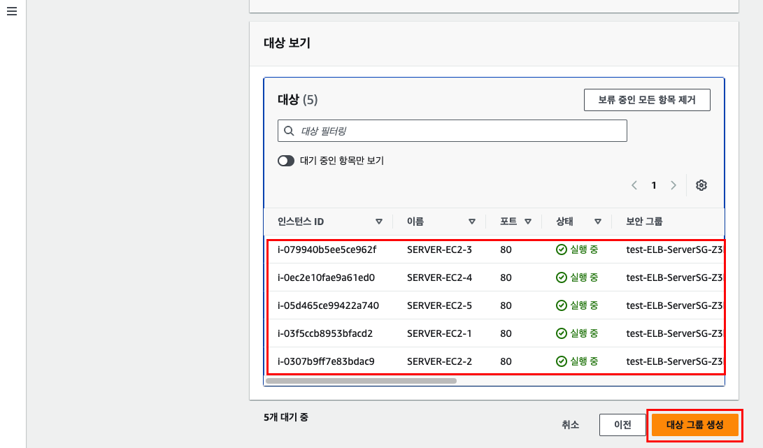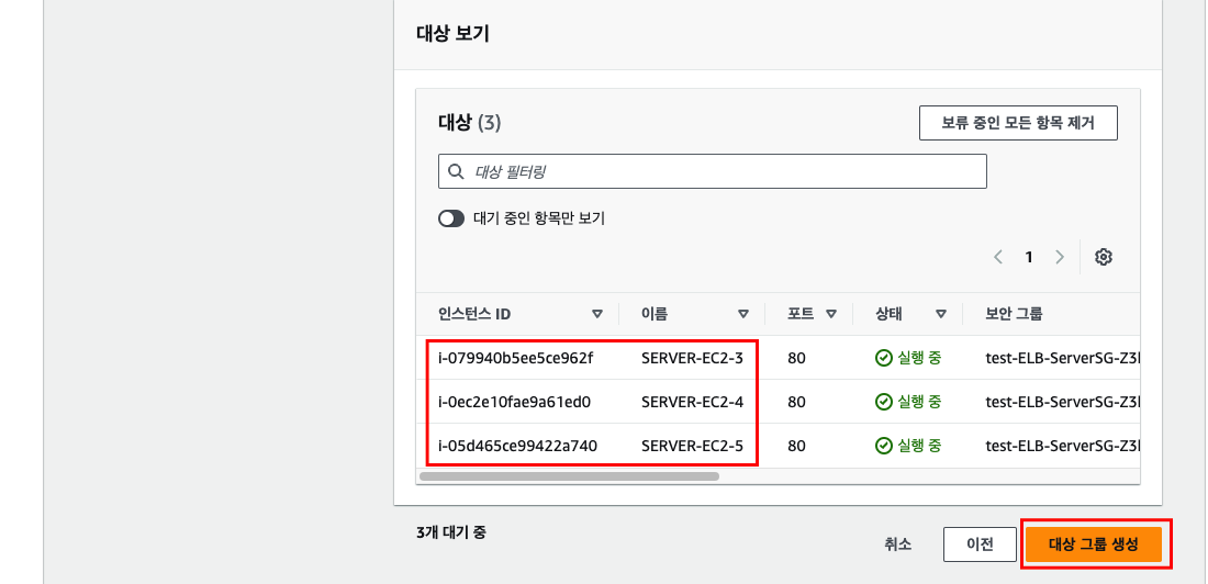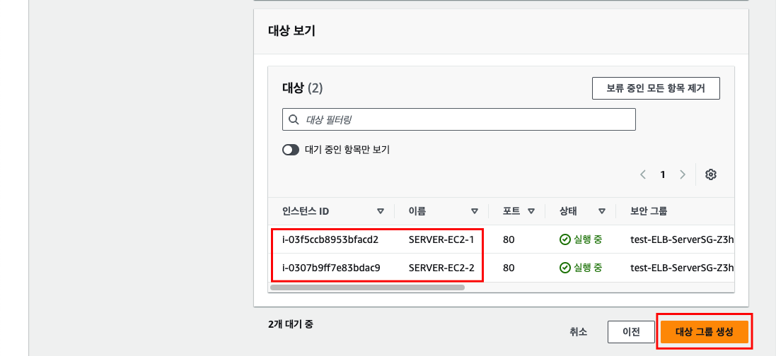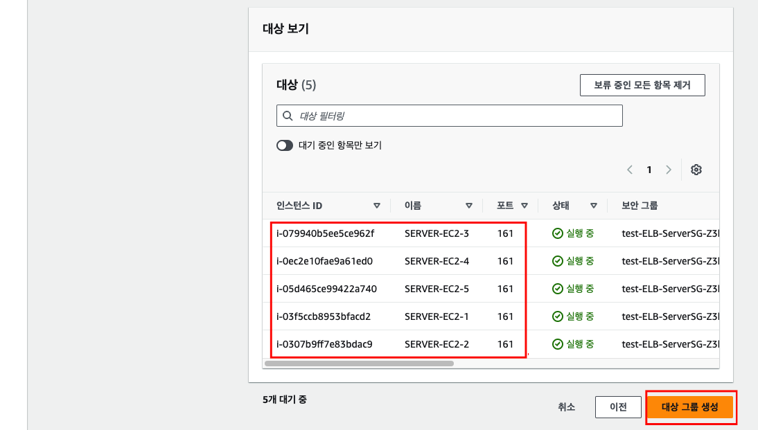 - 모든 인스턴스가 대상으로 추가됨을 확인 → 대상 그룹 생성 클릭