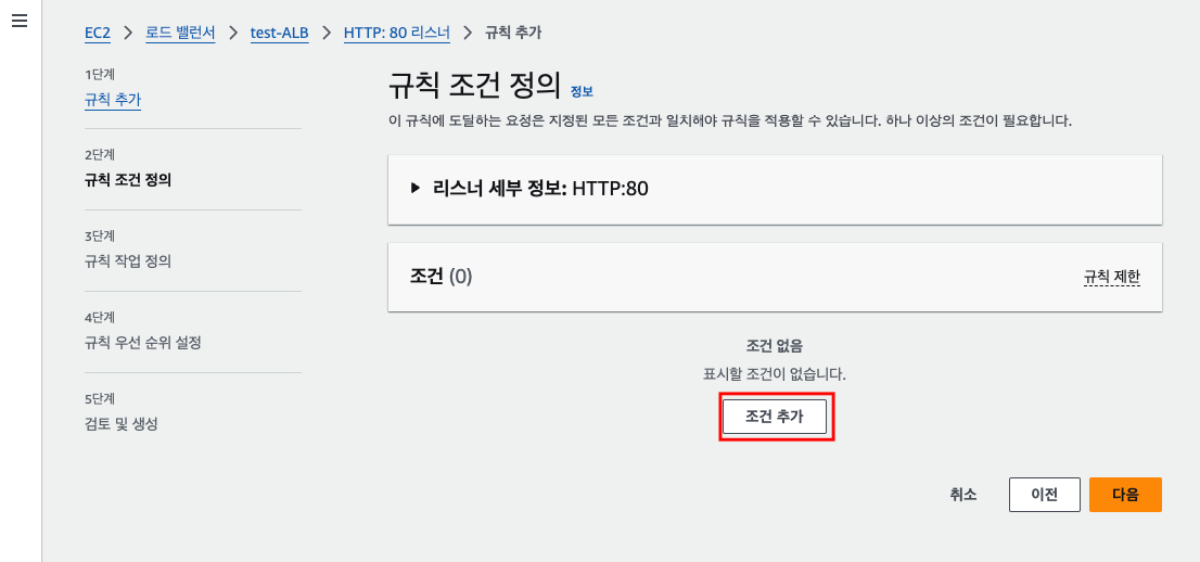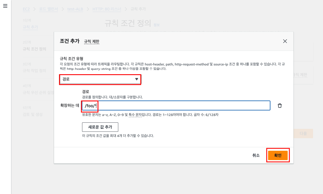 - 조건 추가 클릭 → 규칙 조건 유형: 경로 선택 → 경로에 “/foo/*” 입력 → 확인 클릭 → 다음 클릭