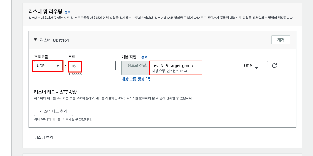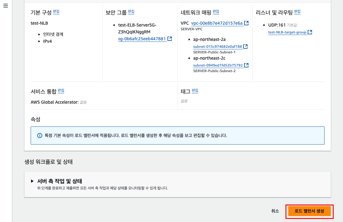 - 로드 밸런서 이름 입력 → SERVER-VPC 선택 → 가용 영역 모두 체크 → 보안 그룹 선택 → 프로토콜: UDP 선택 → 포트: 161 입력 → 다음으로 전달: 생성한 대상 그룹 선택 → 로드 밸런서 생성 클릭
