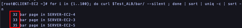 for i in {1..100}; do curl $Test_ALB/bar/ --silent ; done | sort | uniq -c | sort -n