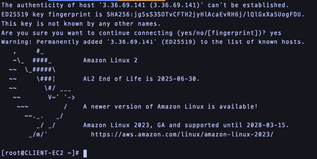 - 터미널 실행 → ssh로 CLIENT-EC2 인스턴스 접속