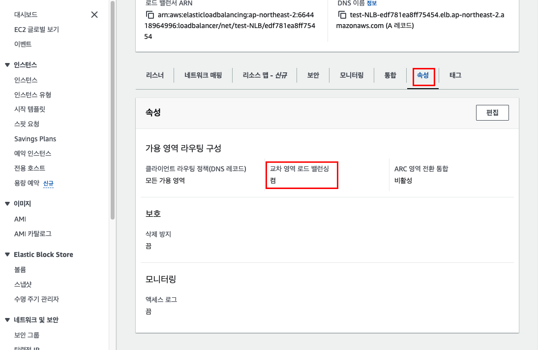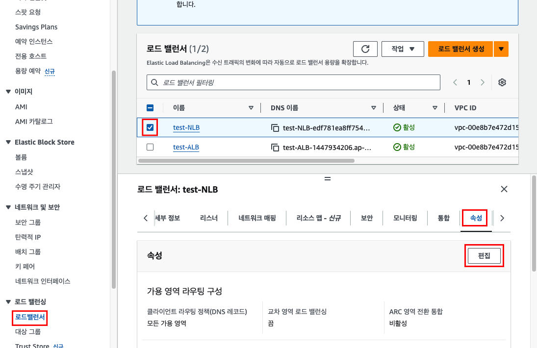 - 왼쪽의 로드밸런서 클릭 → 생성한 NLB 체크 → 속성 탭 클릭 → 편집 클릭