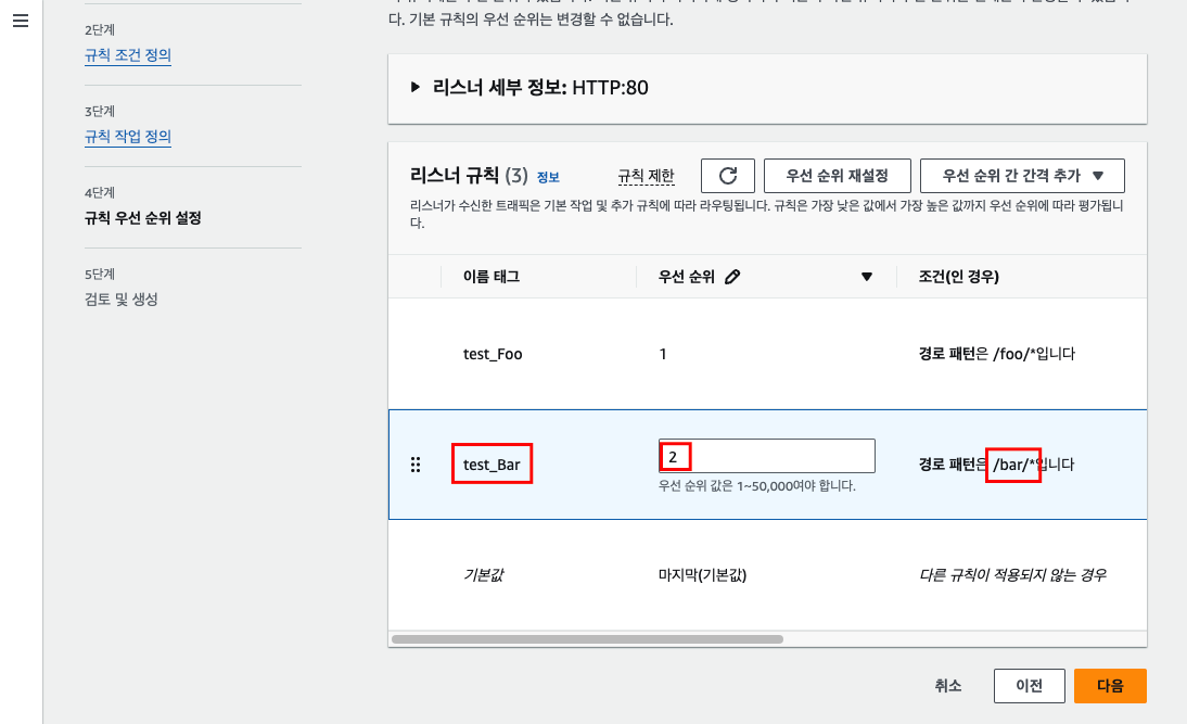 ⇒ foo 경로로 요청함 → 우선 순위 1 규칙인 경로 기반 라우팅이 먼저 이루어짐 → SERVER EC2-1, SERVER EC2-2로만 라우팅됨 → 우선순위 마지막 규칙에 따라 균등하게 부하 분산됨