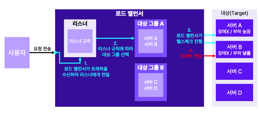 - 클라이언트 요청 수신 → 리스너로 전달 → (리스너가 대상 그룹을 선택하면) → 대상 그룹 내 서버들의 헬스 체크 진행 → 트래픽을 적절한 서버로 전달