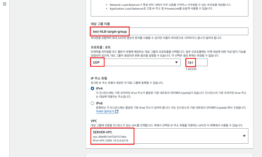- 인스턴스 선택 → 대상 그룹 이름 입력 → 프로토콜: UDP 선택 → 포트: 161 입력 → SERVER-VPC 선택