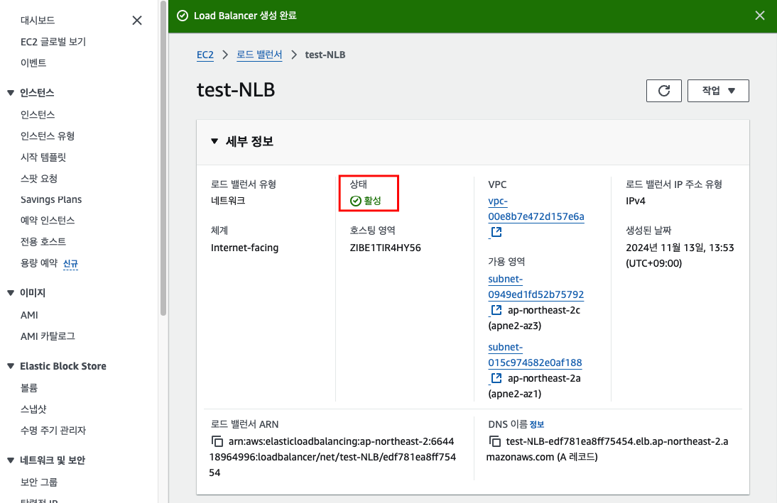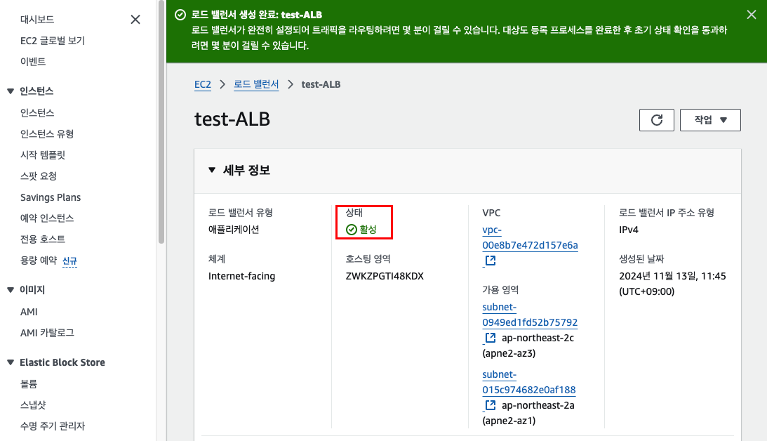 - 시간이 지나고 새로고침 클릭 → 상태가 (프로비저닝 중) ⇒ (활성) 으로 변경됨을 확인