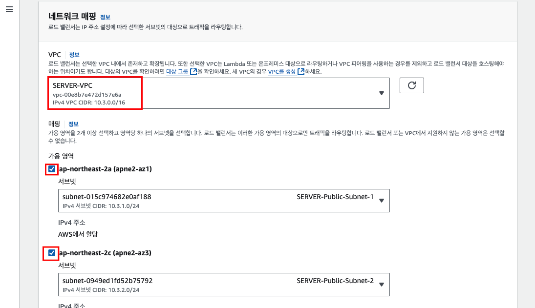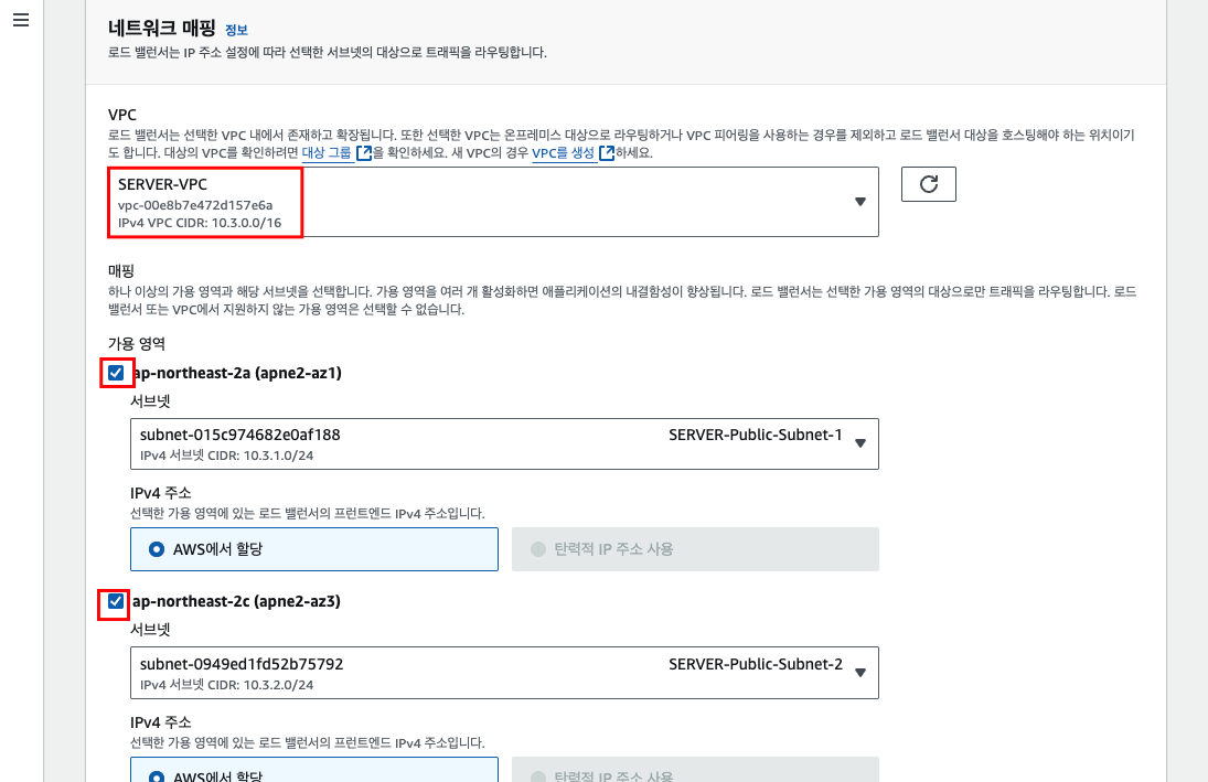 - 로드 밸런서 이름 입력 → SERVER-VPC 선택 → 가용 영역 모두 체크 → 보안 그룹 선택 → (리스너 및 라우팅에서) 다음으로 전달: 이전에 생성한 대상 그룹 선택 → 로드 밸런서 생성 클릭