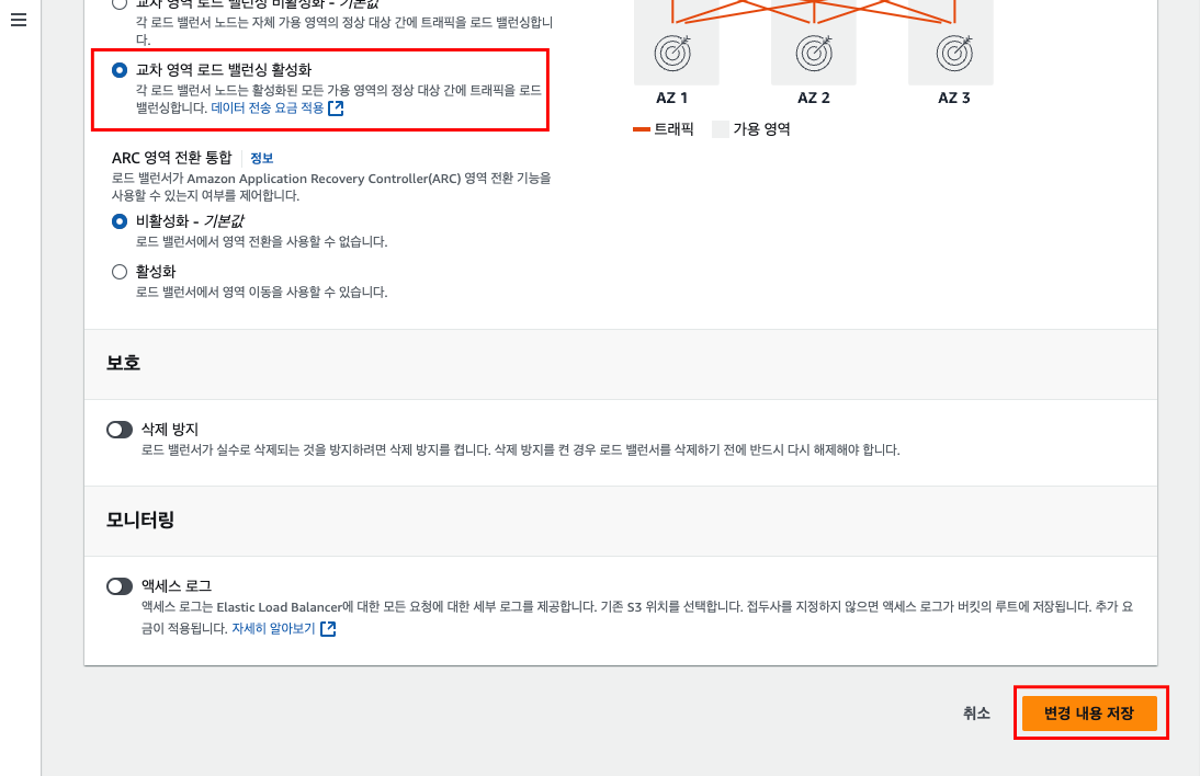 - 교차 영역 로드 밸런싱 활성화 체크 → 변경 내용 저장 클릭