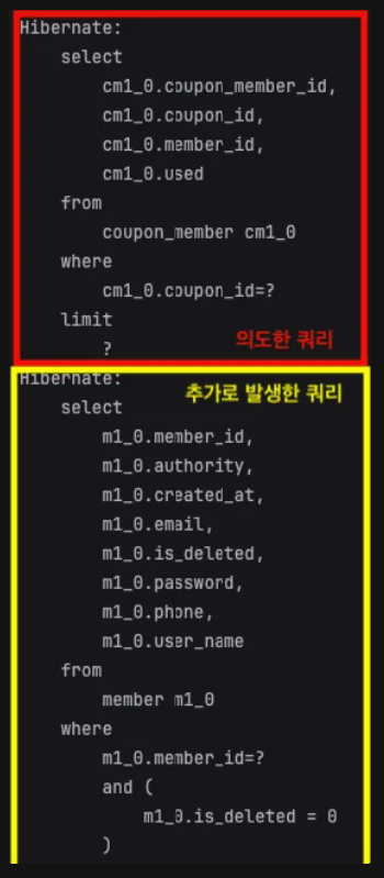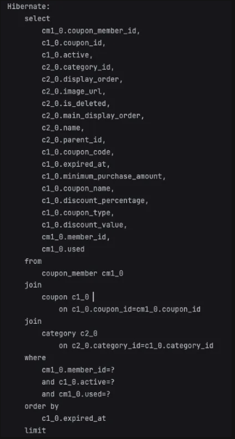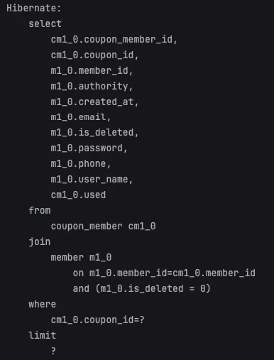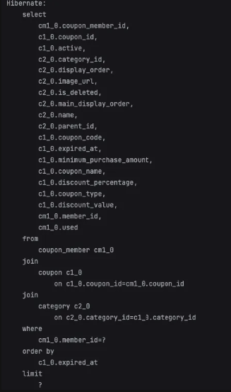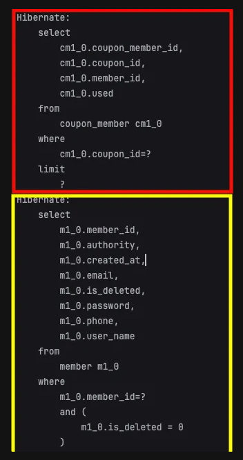 - 추가적으로 발생한 3개의 쿼리는 쿠폰을 보유한 회원을 조회하는 쿼리임을 확인