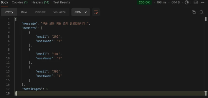 - 쿠폰 보유 회원 목록 조회 시 CouponMember 테이블에서 특정 쿠폰 id에 해당하는 객체를 가져오는 메서드 호출함