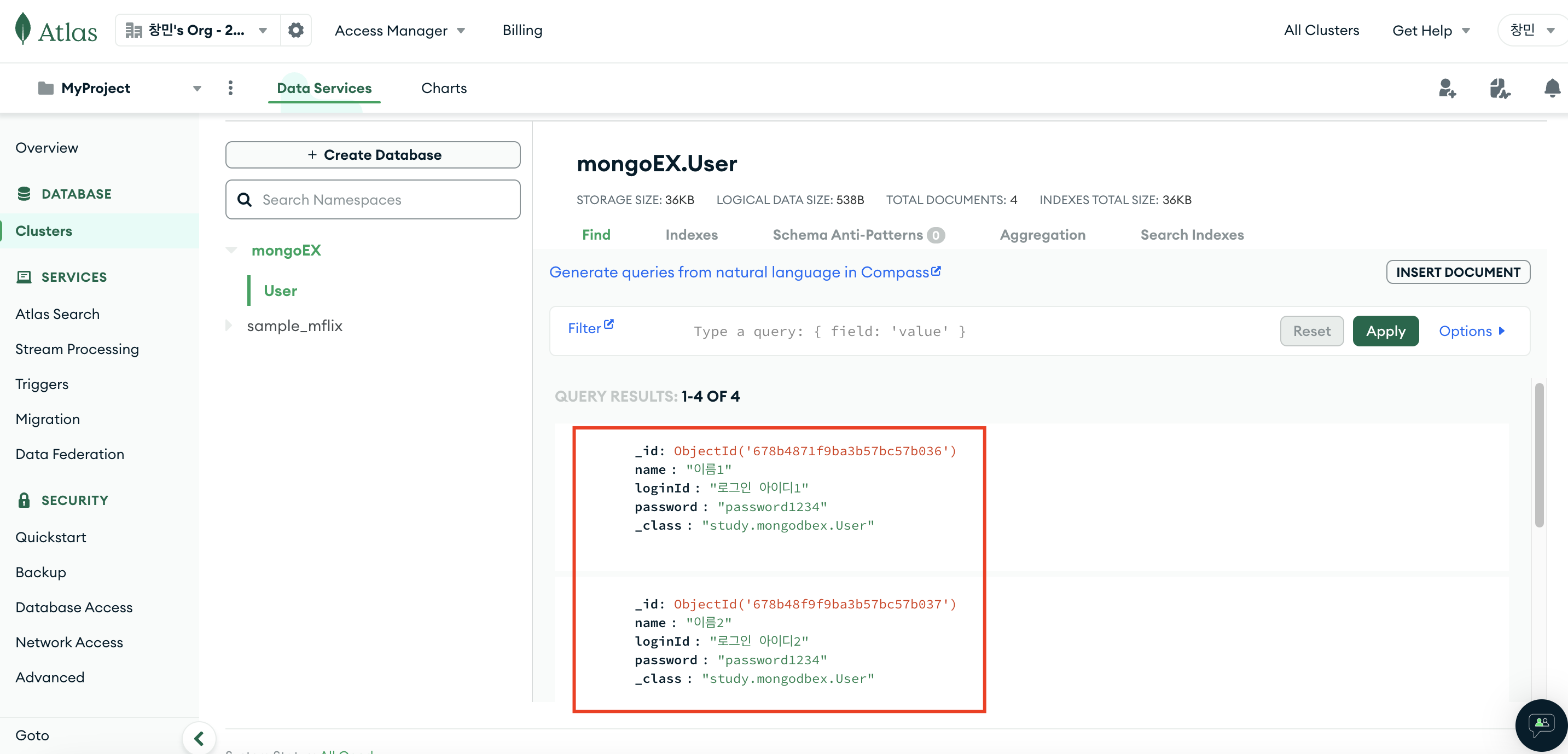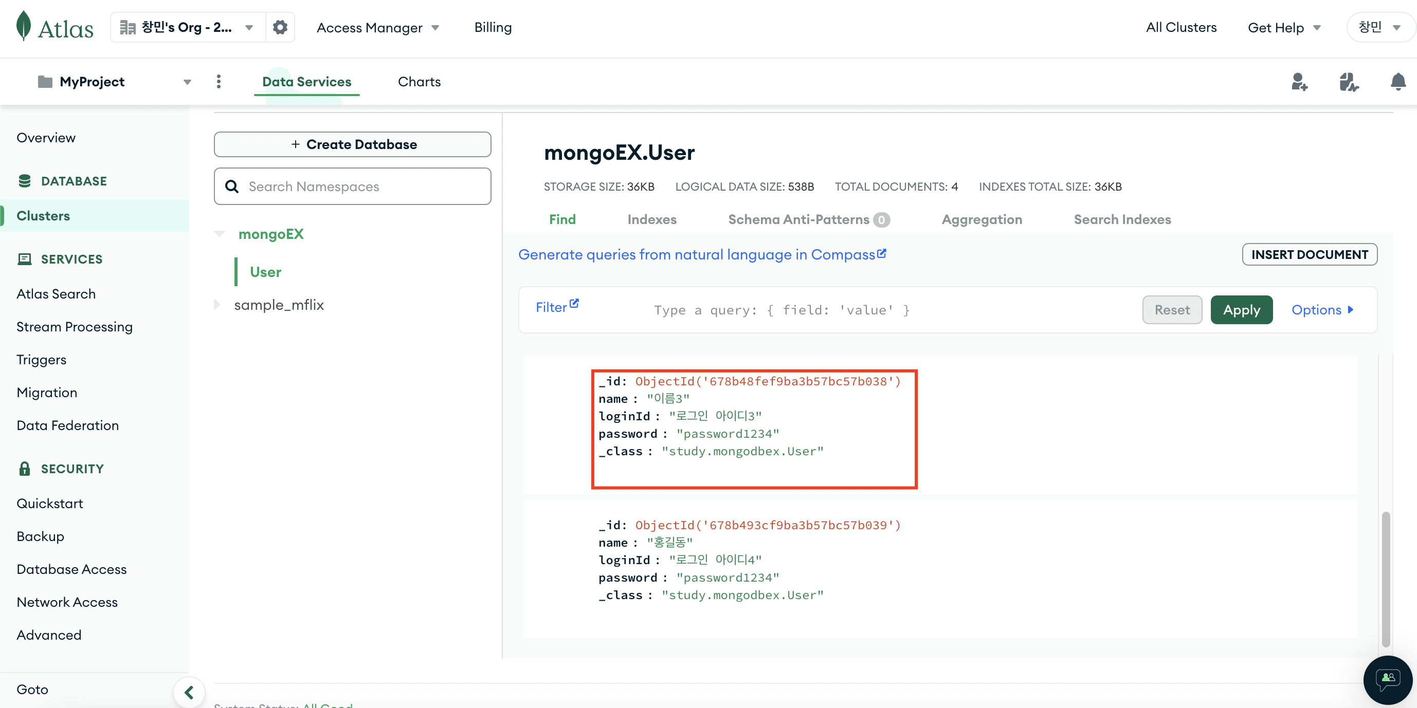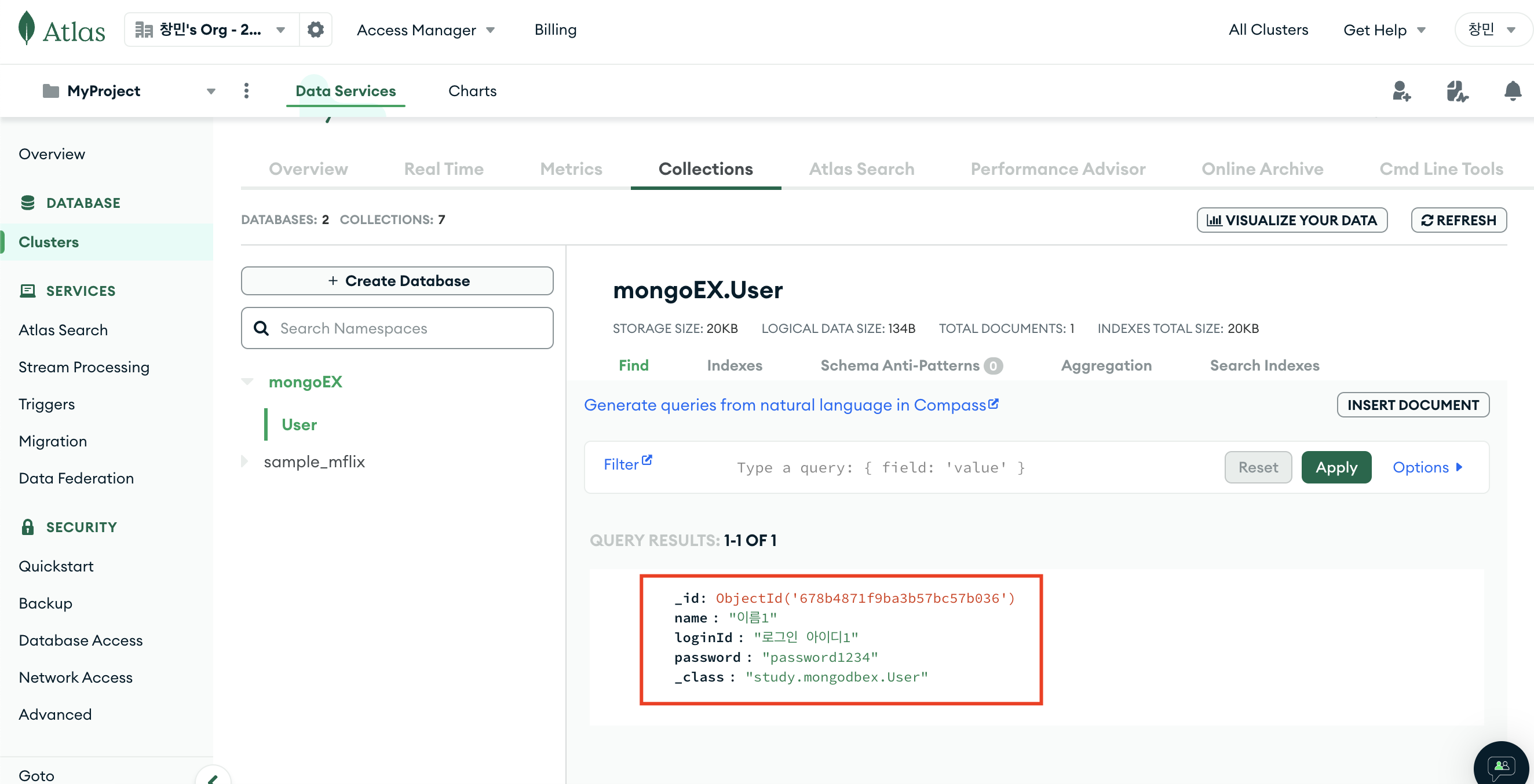 @Document(collection = "User") // mongoDB에서 생성한 컬렉션 이름