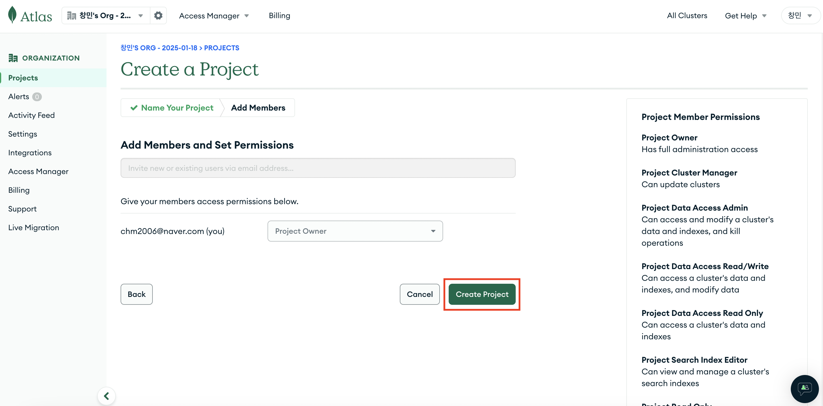 4. Project 접근 멤버 추가 (없다면 스킵) → Create Project 클릭