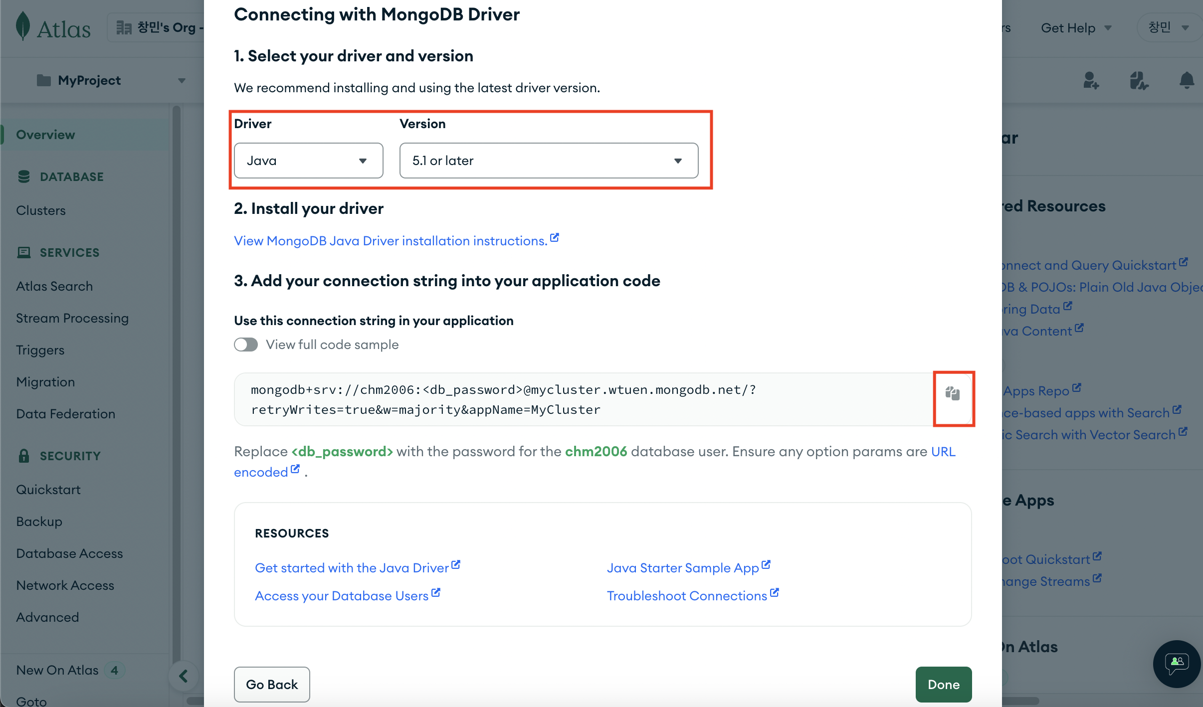 7. 자바 버전 선택 → connection string 복사