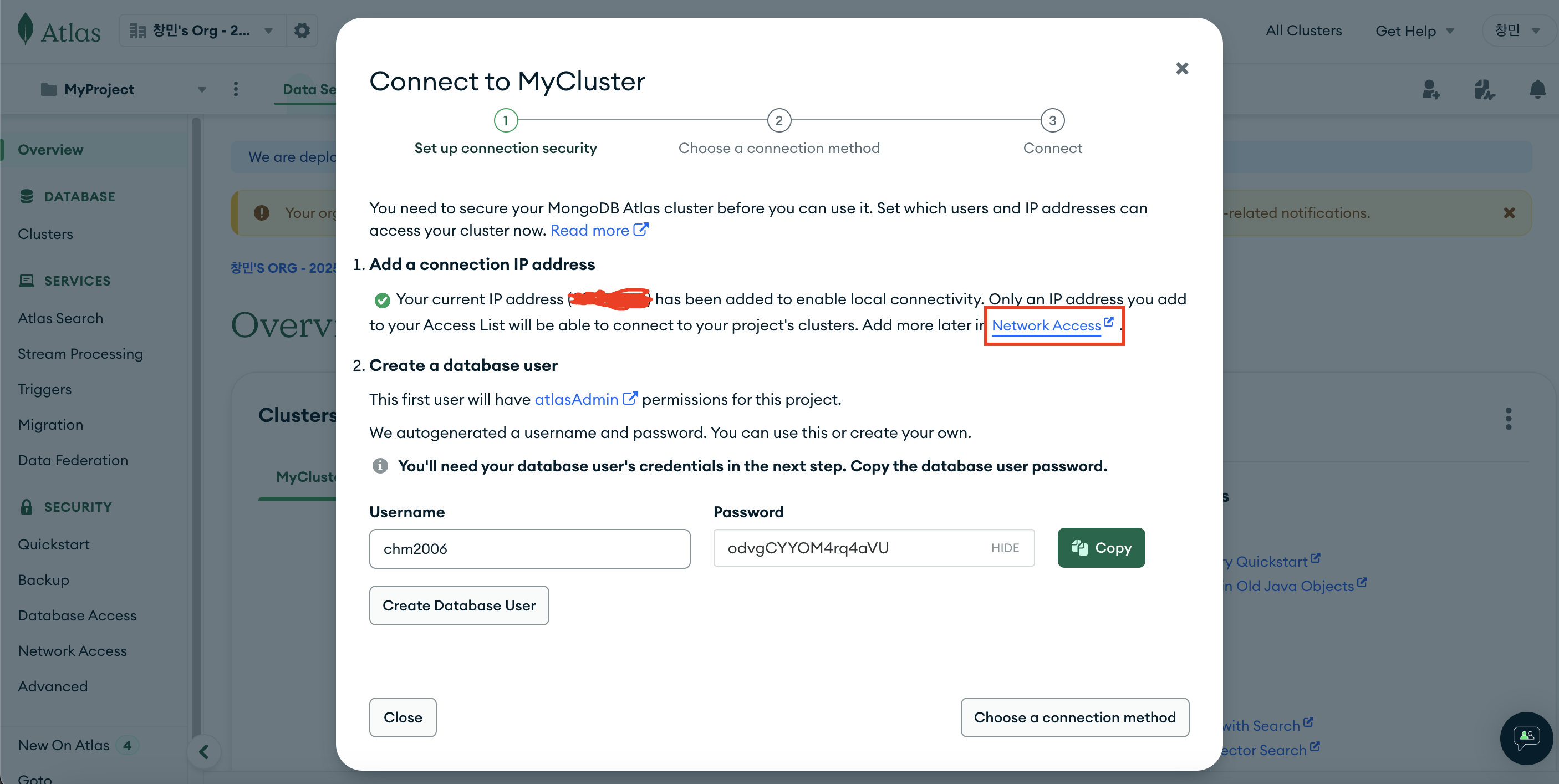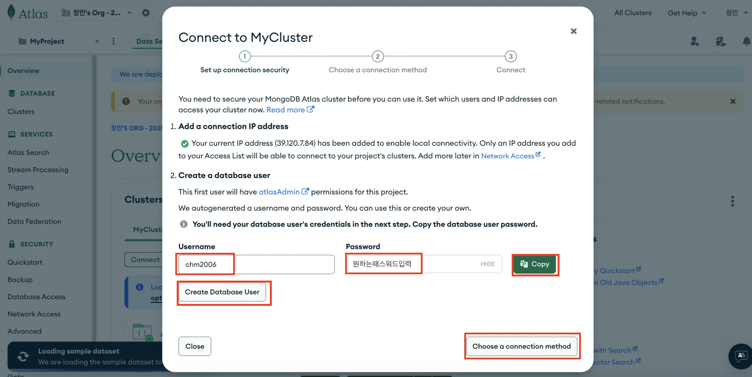 - Username, password 입력 → Copy 클릭 → Create Database User 클릭 → Choose a connection method 클릭