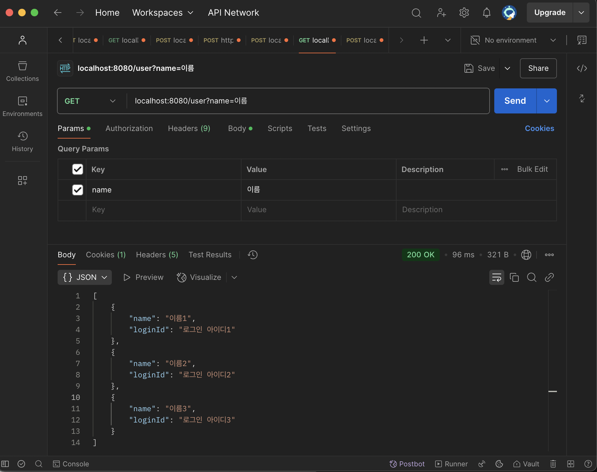 - [GET] localhost:8080/user?name=이름